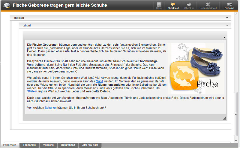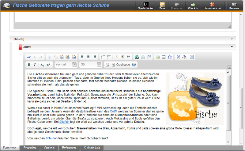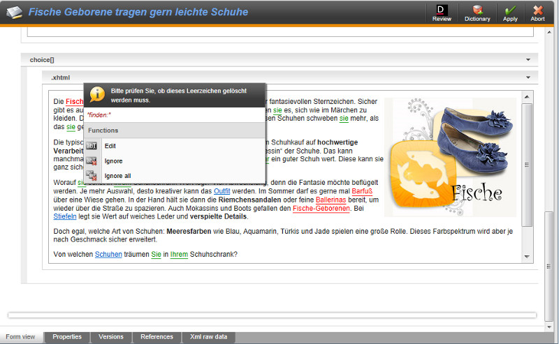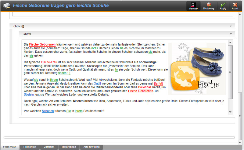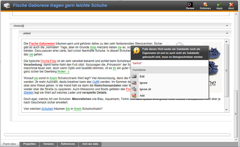 The Duden Corrector for onion.net applies the Duden correction software on onion.net documents. onion.net documents are structured by a set of elements and attributes, which might have been specifically configured according to project-specific requirements. A "document" in this context denotes the set of information which is processed in the progressive forms of the editor and checked-out, edited and stored as a whole, or a subset thereoff which is displayed in the same "tab". In the example illustrated, it is all the information in the tab "content".