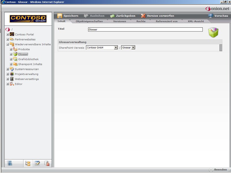 In this example, the onion.net SharePoint integration is used to feed the onion.net glossary module by items, which are maintained by intranet users in an associated SharePoint ® list. The SharePoint list is connected only once by means of the onion.net editor. Thereafter, any item in this SharePoint list is automatically available to be used by onion.net powered websites.