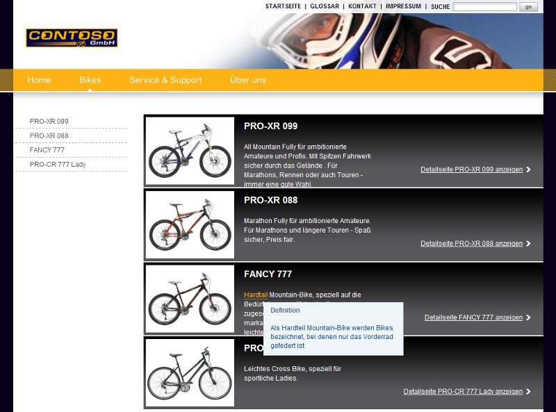 This has the effect, that the onion.net glossary module shall automatically link the (public) website's glossary page to the items from the glossary. For convenience this is only done once per content page, namely at the very first occurance of the item on the page. Moreover, a "tooltip" is being attached automatically to those items in order to provide a short explanation as a "mouseover" effect.