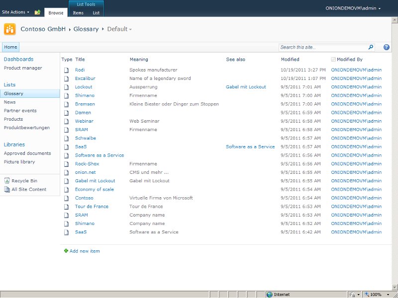 Die onion.net SharePoint Integration stellt in diesem Beispiel ein Glossar aus SharePoint ® in onion.net zur Verfügung. Das Glossar wird einmalig im onion.net Editor verknüpft. Danach stehen sie für das onion.net Glossar Modul automatisch zur Verfügung, das bedeutet alle in SharePoint gepflegten Glossen werden beim erststmaligen Auftreten auf der Seite von onion.net verlinkt und als Tooltip angezeigt.